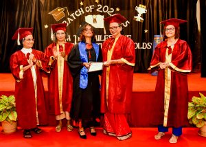 The ceremony was graced by several distinguished dignitaries. Prof. Dr. Radhika Nayak, an accomplished academician with numerous accolades, was the Chief Guest and inspired the graduating students with her address, emphasizing the importance of perseverance, lifelong learning, and contributing positively to society. The officiating principal, Dr. Aldina Braganza, also addressed the gathering, extending her best wishes to the graduates and highlighting the college’s commitment to nurturing holistic development. Other dignitaries present included Sister Jonily A.C., Provincial Superior of the Western Province of the Apostolic Carmel in India, representing the management, and Ms. Sajani D’Costa, Student Council Coordinator.