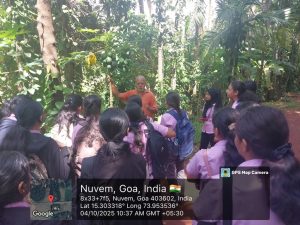 As part of the Semester I academic curriculum for the B.Sc. Botany (Major) course in Fundamentals of Botany (BOT-100) and the Skill Enhancement Course (SEC) in Nursery and Gardening (BOT-141), a field study trip was organized for 19 F.Y. B.Sc. Botany students to Laban’s Organic Farm (KOCL research farm), Nuvem, on 04th October 2025. The visit was coordinated and accompanied by Dr. Puja Sakhalkar and Dr. Kim Rodrigues. The objective of the trip was to integrate theoretical learning on plant diversity with field observations and to relate the concepts of nursery and gardening operations with practical field experience.