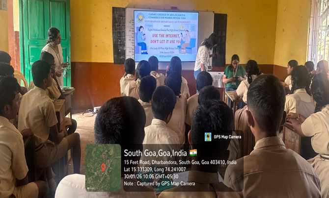 The Postgraduate Department of Psychology organized a community outreach initiative in the form of a digital wellness session titled “Use the Internet, Don’t Let It Use You” for the students of Our Lady of Piety High School, Collem, Goa, on 30th January 2026, from 10:00 a.m. to 11:00 a.m. The program was attended by 114 high school students and was conducted by three postgraduate students under the guidance of a faculty member.
